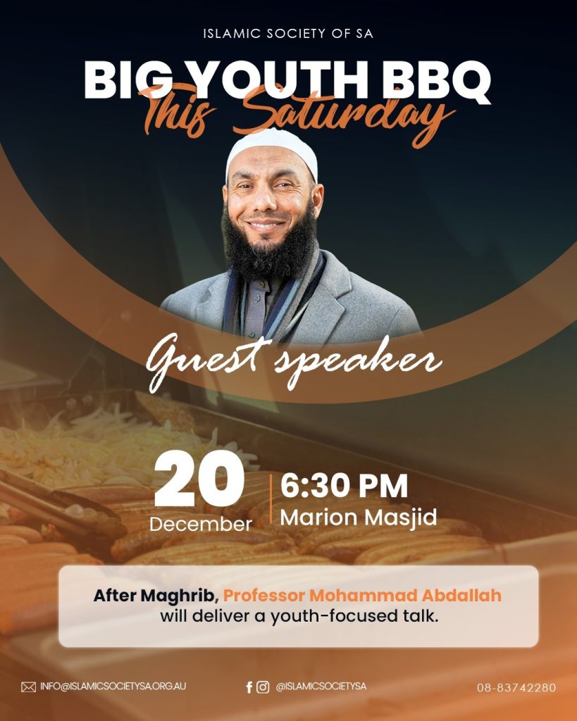 This Saturday, donβt miss our BIG YOUTH BBQ at Marion Masjid. Enjoy great food, good vibes, and a youth-focused talk by Professor Mohammad Abdalla after Maghrib.